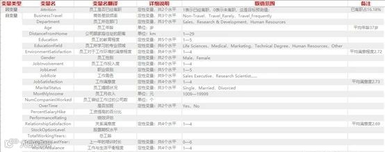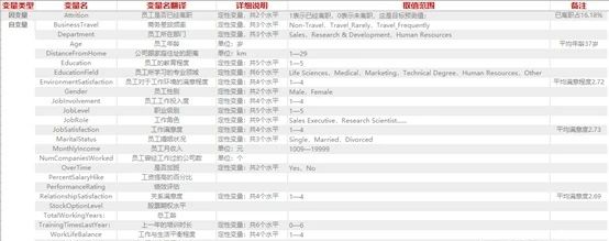 我们使用的数据是EXCEL数据文件格式,其中自变量30个,因变量为是否离职。下表对所有变量进行了说明,以便更好的理解数据。