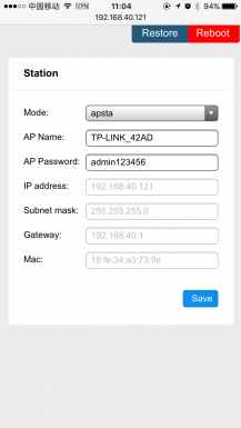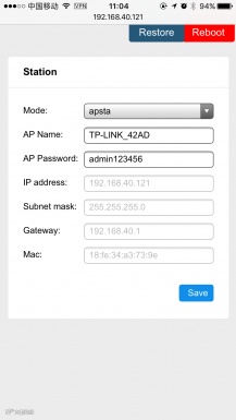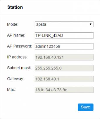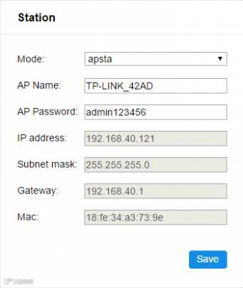 选择apsta模式,设置路由器ssid,passwd,点击保存。模组切换到apsta模式,并连接wifi路由器。连接成功后,刷新网页获取到station的IP信息。可通过串口验证路由器和IP信息。