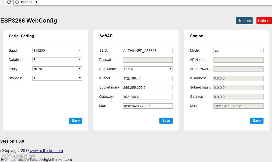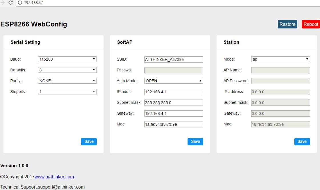 2017年5月18日,安信可ESP8266模组 AT固件升级至 V0.0.0.6 版本,新增webconfig&GPIO0 restore,使用说明:AT 0.0.0.6版本新功能