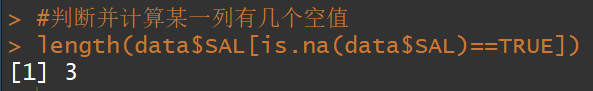 #判断并计算某一列有几个空值length(data$SAL[is.na(data$SAL)==TRUE])