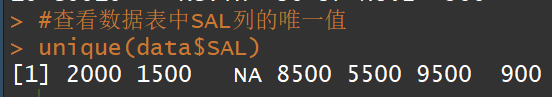 #查看数据表中SAL列的唯一值unique(data$SAL)