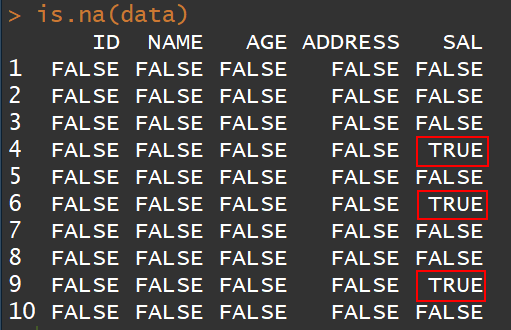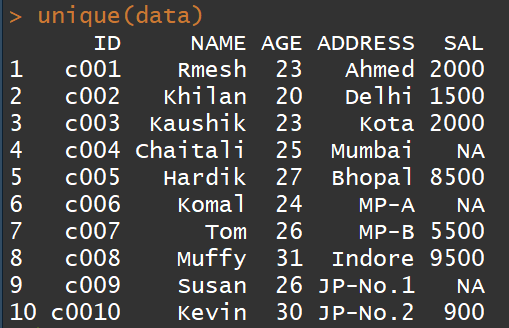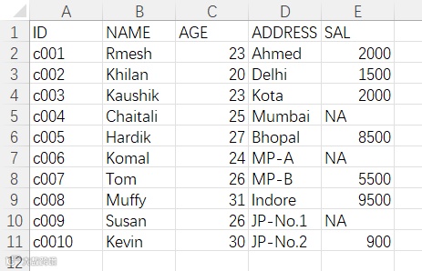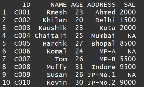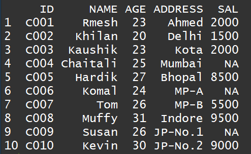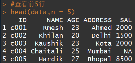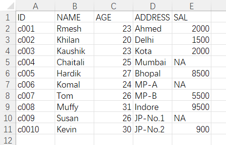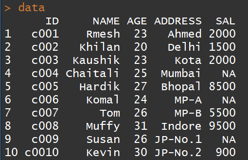 #手动创建数据表data<-data.frame(ID=c("c001","c002","c003","c004","c005","c006","c007","c008","c009","c0010"),NAME=c("Rmesh","Khilan","Kaushik","Chaitali","Hardik","Komal","Tom","Muffy","Susan","Kevin"),AGE=c(23,20,23,25,27,24,26,31,26,30),ADDRESS=c("Ahmed","Delhi","Kota","Mumbai","Bhopal","MP-A","MP-B","Indore","JP-No.1","JP-No.2"),SAL=c(2000,1500,2000,NA,8500,NA,5500,9500,NA,900))