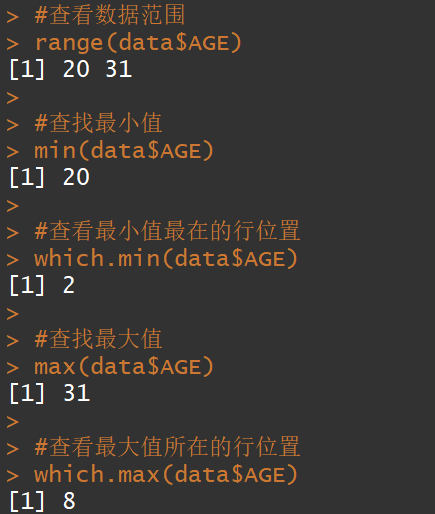 #查看数据范围range(data$AGE)#查找最小值min(data$AGE)#查看最小值最在的行位置which.min(data$AGE)#查找最大值max(data$AGE)#查看最大值所在的行位置which.max(data$AGE)