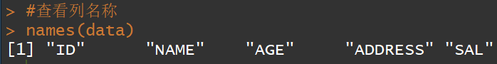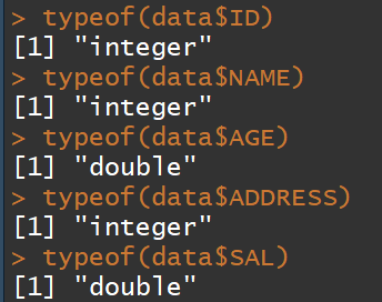 typeof(data$ID)typeof(data$NAME)typeof(data$AGE)typeof(data$ADDRESS)typeof(data$SAL)