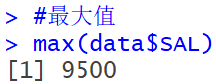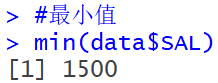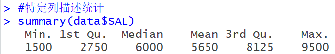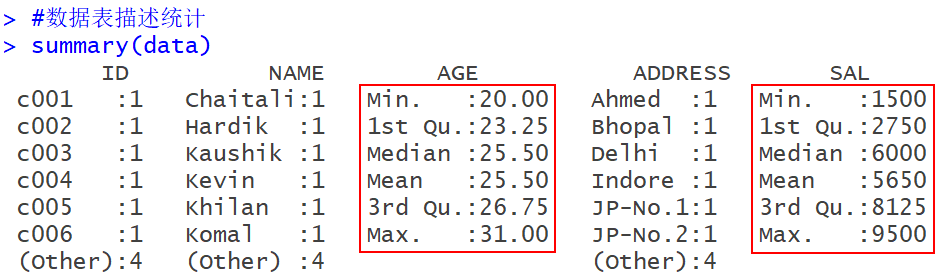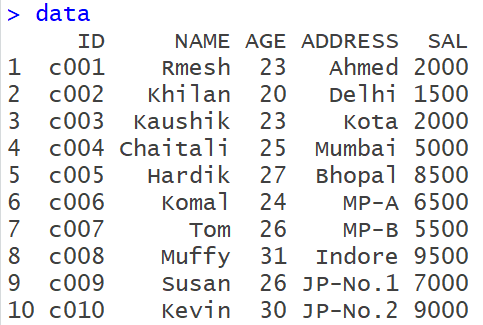 #手动创建数据表datadata<-data.frame(ID=c("c001","c002","c003","c004","c005","c006","c007","c008","c009","c010"),NAME=c("Rmesh","Khilan","Kaushik","Chaitali","Hardik","Komal","Tom","Muffy","Susan","Kevin"),AGE=c(23,20,23,25,27,24,26,31,26,30),ADDRESS=c("Ahmed","Delhi","Kota","Mumbai","Bhopal","MP-A","MP-B","Indore","JP-No.1","JP-No.2"),SAL=c(2000,1500,2000,5000,8500,6500,5500,9500,7000,9000))