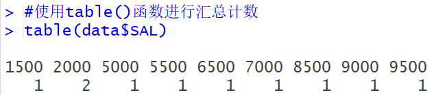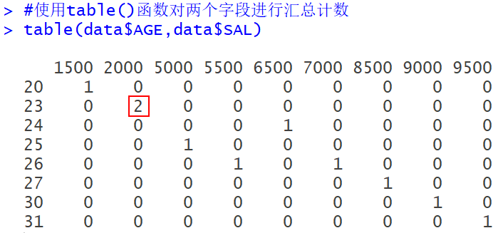 #使用table()函数对两个字段进行汇总计数table(data$AGE,data$SAL)