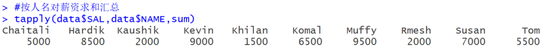 #按人名对薪资求和汇总tapply(data$SAL,data$NAME,sum)