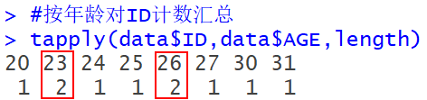 #按年龄对ID计数汇总tapply(data$ID,data$AGE,length)