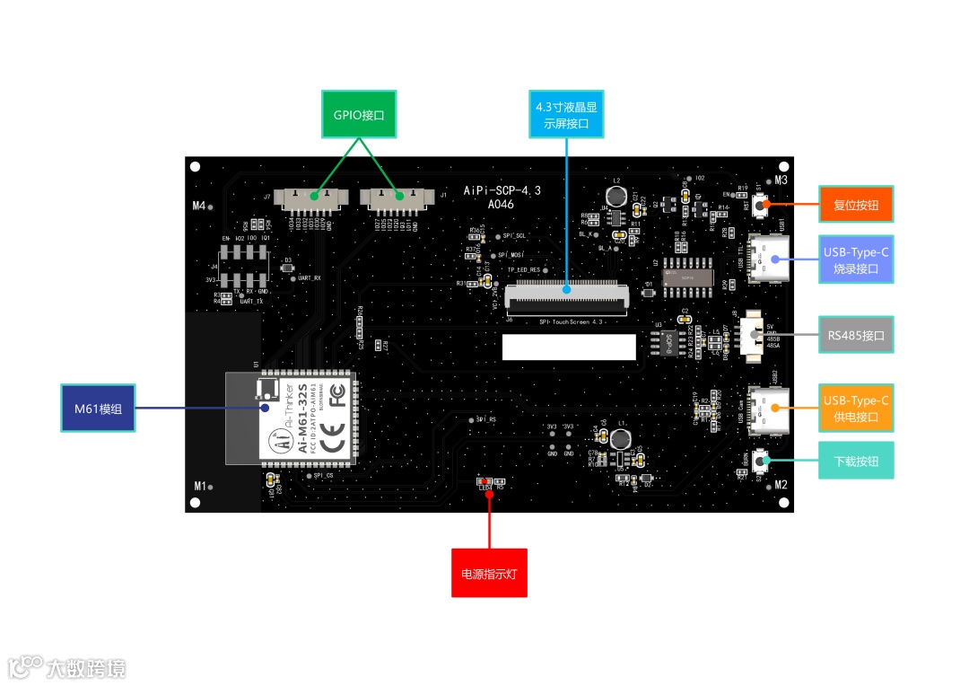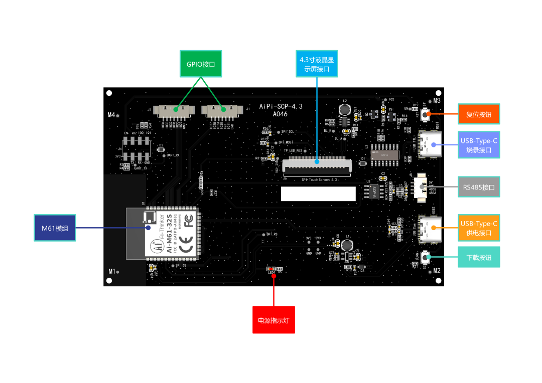 采用安信可M61无线模组为控制核心,通过M61芯片驱动4.3寸(480*272)RGB液晶屏,外接RS485通信接口,采用Tpye-C接口进行供电,将其余的IO口引出作为GPIO接口方便拓展。