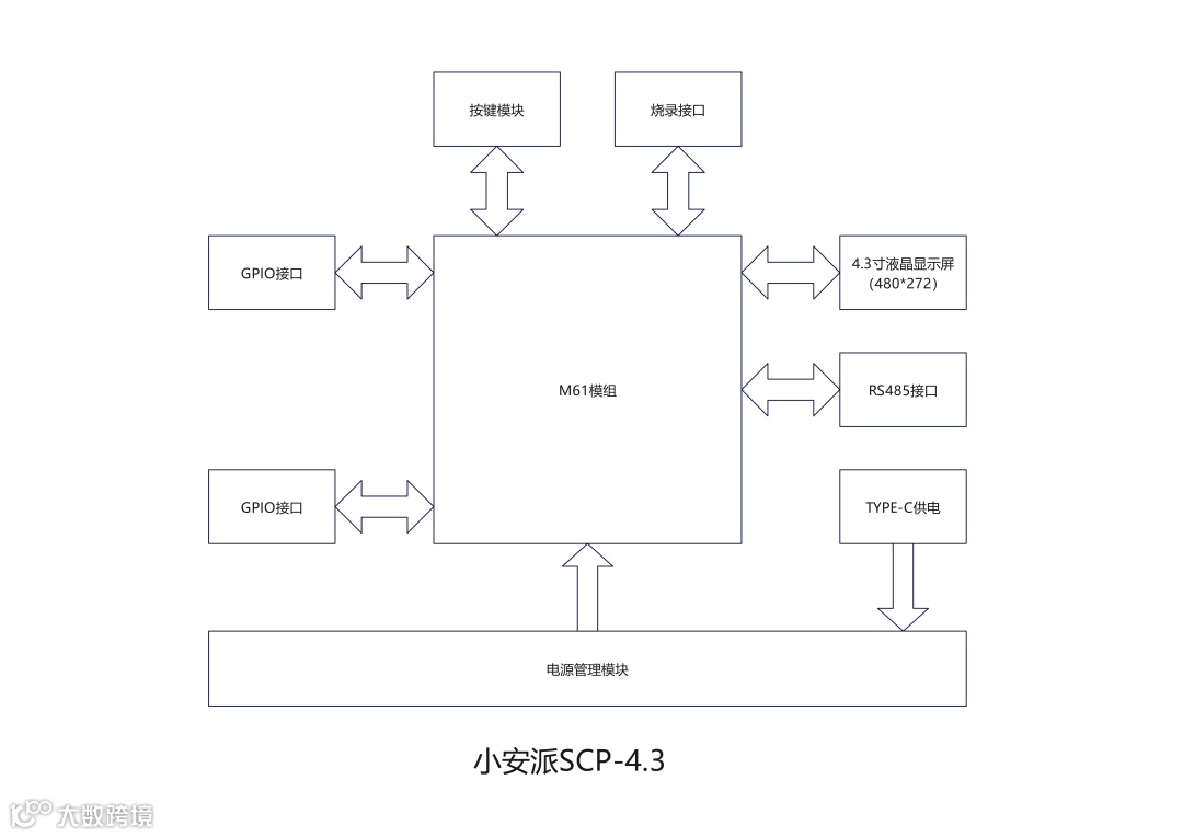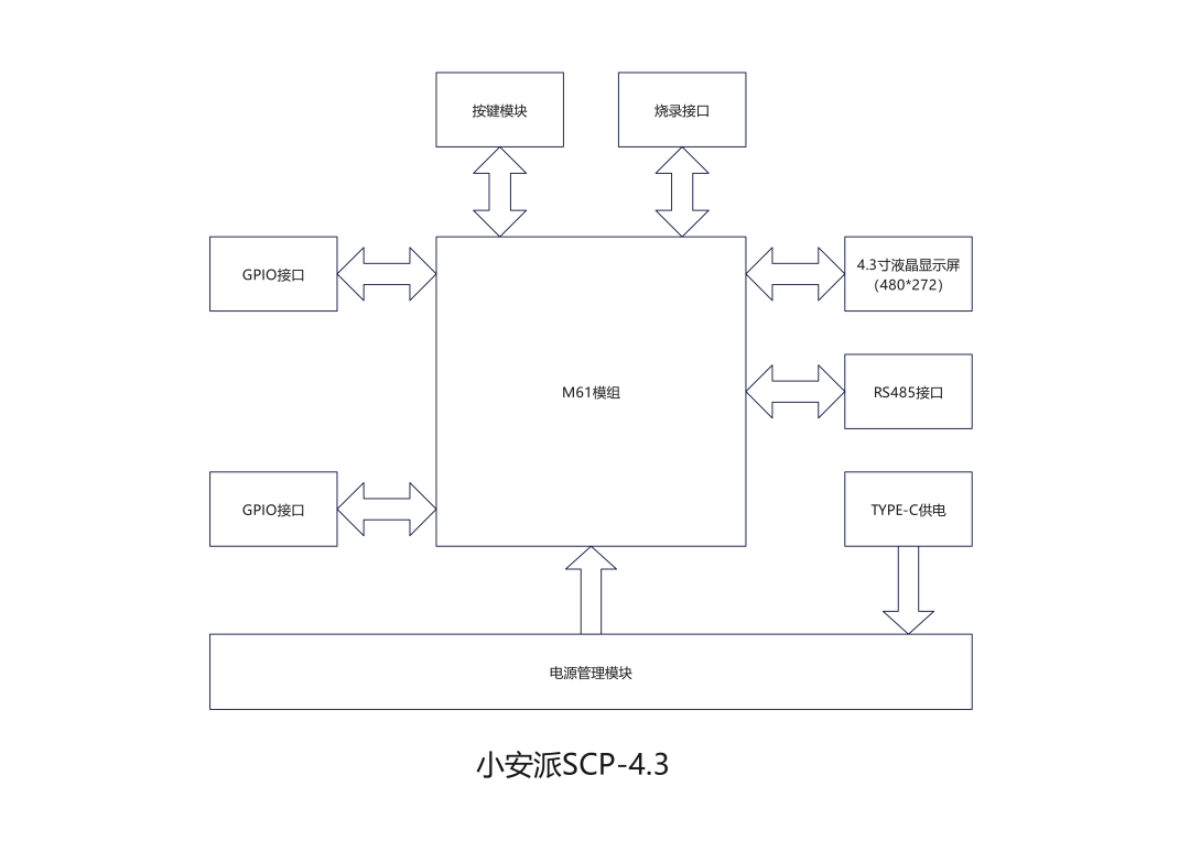 小安派-SCP-4.3具有4.3寸液晶显示模块、按键模块、RS485接口、Type-C供电模块。