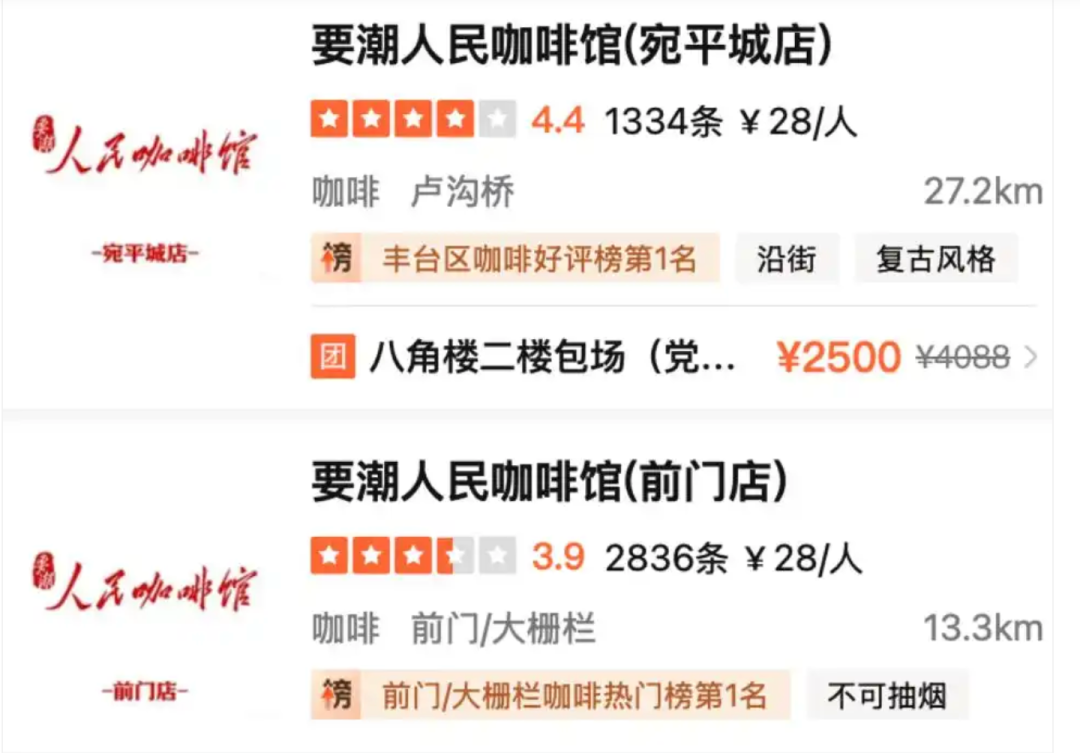 宣告无效前,要潮公司名下咖啡馆上虽然有“爱人民咖啡馆”、“潮人民咖啡馆”、“要潮人民咖啡馆”等注册商标。但查询他多家直营店门面图片发现,并没有“潮”和“要潮”的字样展示出来,各门店均为“人民咖啡馆”样式的招牌。