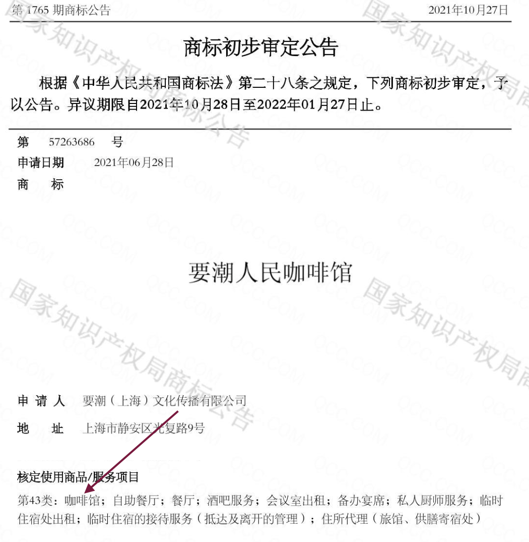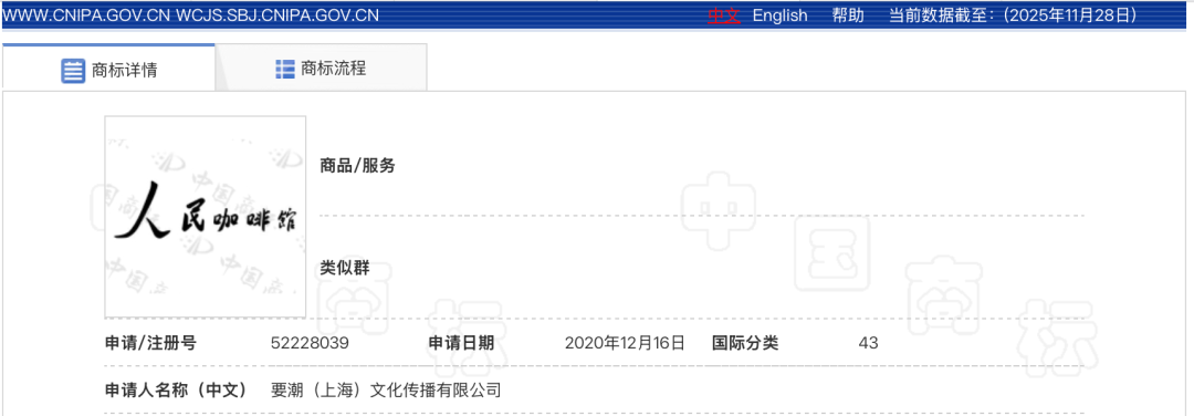 以要潮公司2020年12月申请的第30、43类52228039号“人民咖啡馆”为例: