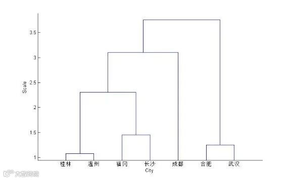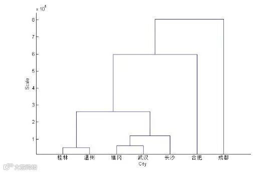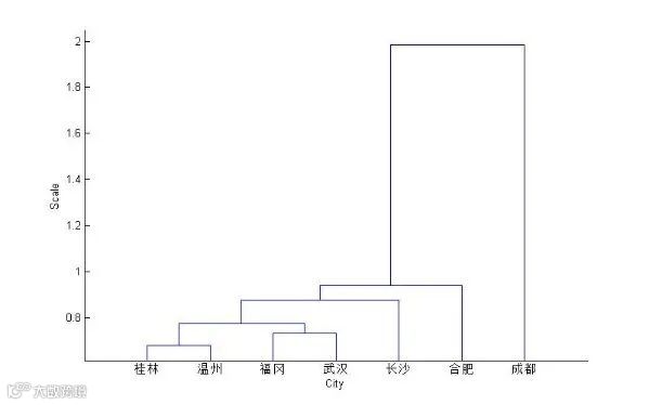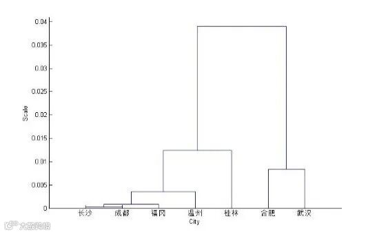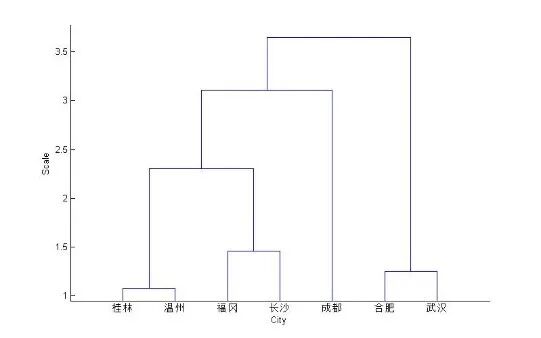 S=['福冈';'合肥';'武汉';'长沙';'桂林';'温州';'成都'];X=[16.21492 2000 -8.2 6.2;15.7 970 2209 -20.6 1.9;16.3 1260 2085 -17.3 2.8;17.2 14221726 -9.5 4.6;18.8 1874 1709 -4.9 8.0;17.9 1698 1848 -4.5 7.5;16.3 976 1239-4.6 5.6];D=pdist(X,'mahal');M=squareform(D);Z=linkage(D,'single');H=dendrogram(Z,'labels',S);xlabel('City');ylabel('Scale');C=cophenet(Z,D);T=cluster(Z,3);