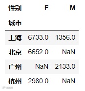 # 增加透视效果df['成交量'].groupby([df['城市'],df['性别']]).sum().unstack()