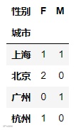 #fill_value = 0缺失值填充pd.pivot_table(df,values = "用户ID",columns ="性别",index="城市",aggfunc="count",fill_value = 0)