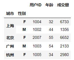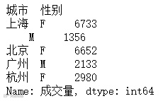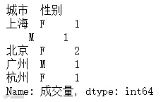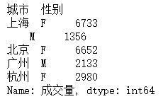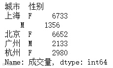 # 先筛选,然后groupby要加dfdf['成交量'].groupby([df['城市'],df['性别']]).sum()