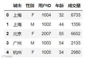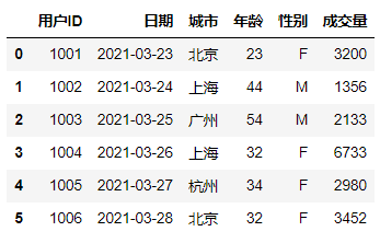 df = pd.DataFrame({'用户ID':[1001,1002,1003,1004,1005,1006],'日期':pd.date_range(datetime.datetime(2021,3,23),periods=6),'城市':['北京', '上海', '广州', '上海', '杭州', '北京'],'年龄':[23,44,54,32,34,32],'性别':['F','M','M','F','F','F'],'成交量':[3200,1356,2133,6733,2980,3452]},columns =['用户ID','日期','城市','年龄','性别','成交量'])df