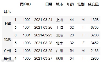 #先groupby()再写列,列不用加dfdf.groupby(['城市','性别'])['成交量'].sum() #求和