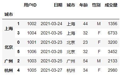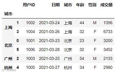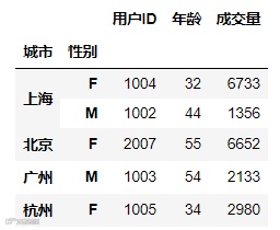 #首先定义一个top函数,使用apply函数进行运算def top(df, n=2, column='成交量'):return df.sort_values(by=column)[-n:] # 自建函数df.groupby('城市').apply(top)