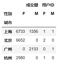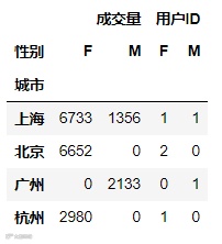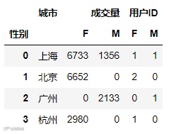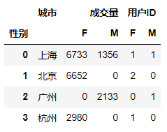 pd.pivot_table(df,values = ["用户ID","成交量"],columns="性别",index="城市",aggfunc={"用户ID":"count","成交量":"sum"},fill_value = 0).reset_index()