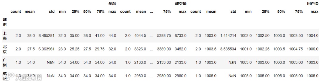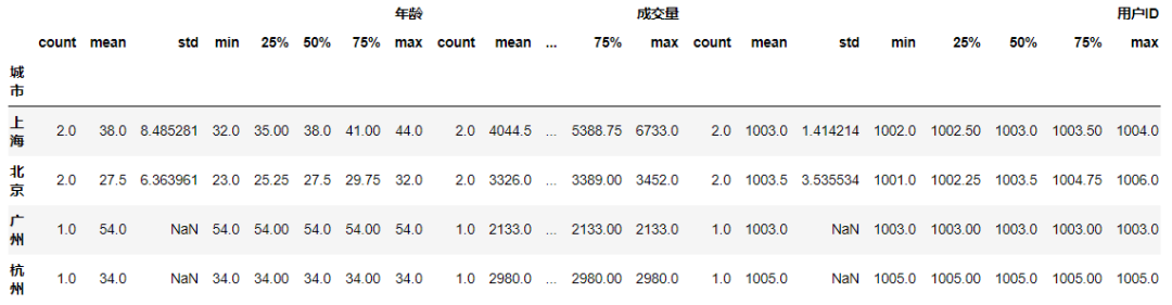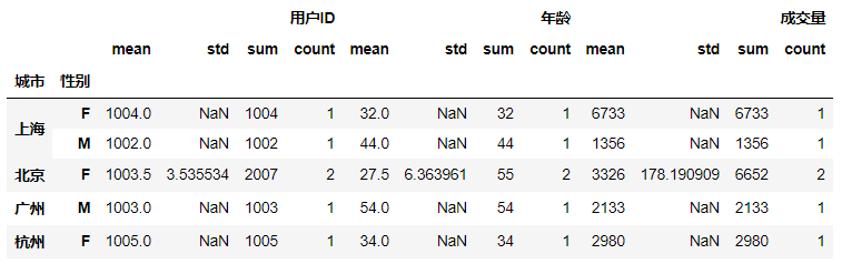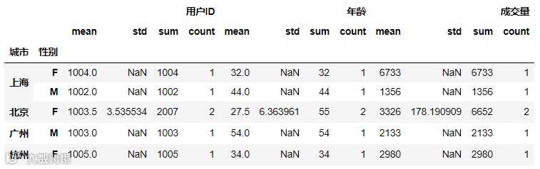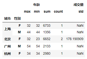 #如果不同列用不同函数,可以对不同的列使用不同的函数df.groupby(['城市', '性别']).agg({'年龄': ['max','min'],'成交量': ['sum', 'count', 'std']})