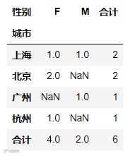 #margins显示合计,margins_name修改合计名称pd.pivot_table(df,values = "用户ID",columns ="性别",index="城市",aggfunc="count",margins = True,margins_name ="合计")