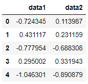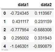 #使用numpy生成两个随机数import numpy as npdf = pd.DataFrame({'data1':np.random.randn(1000),'data2': np.random.randn(1000)})df.head()