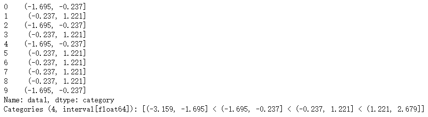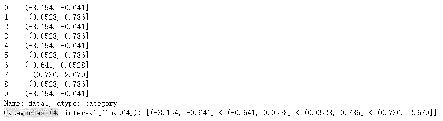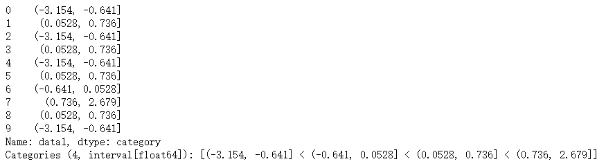 #将数据data1等样本数四等分quriles_1 = pd.qcut(df.data1,4)quriles_1[:10]