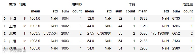 # 列表可以同时使用多个函数df.groupby(['城市', '性别']).agg(['mean','std','sum','count']).reset_index()