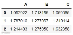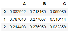 #首先生成A,B,C的一个随机数组import numpy as npdf = pd.DataFrame({'A':np.random.rand(3),'B': np.random.rand(3),'C': np.random.rand(3) })df.head()