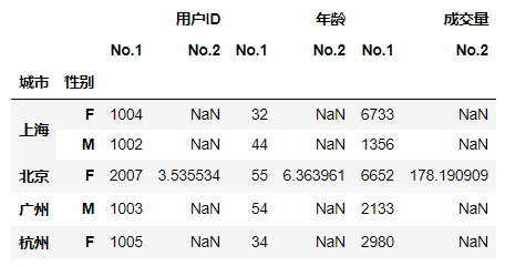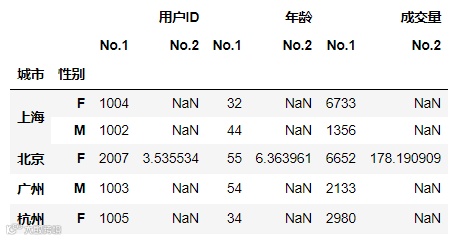 # 可以用元组修改函数名df.groupby(['城市', '性别']).agg([('No.1', 'sum'), ('No.2', 'std')])