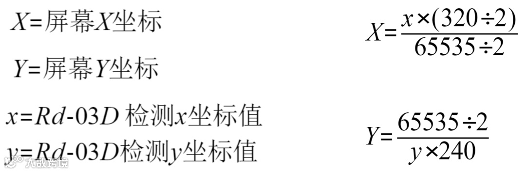 但是Rd-03D实际检测值最高可达到65535(纵坐标没有负值)。而我们的屏幕大小只有320*240,检测出来的坐标值需要经过换算才能在屏幕上显示。本项目用的算法如下: