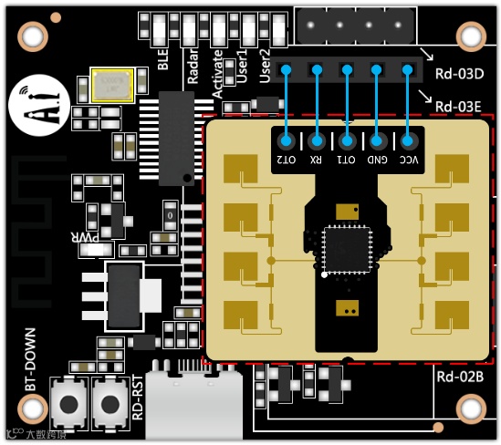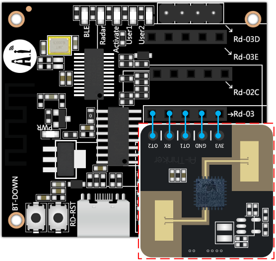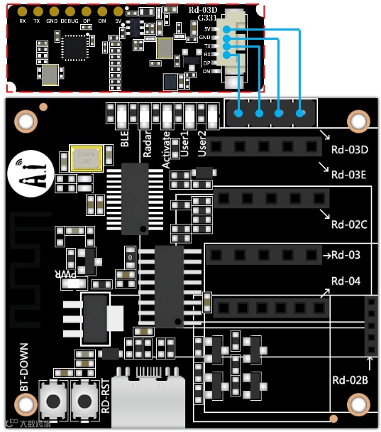1.将Rd-03E接入Rd-Kit,未接入雷达前,Radar LED慢闪,接入成功后Radar LED熄灭。