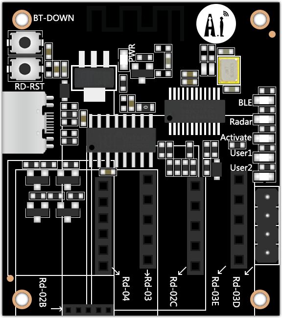 Rd-Kit是由深圳市安信可科技有限公司开发的雷达蓝牙底板。该蓝牙底板核心处理器芯片PHY6252(SSOP24),是一款高集成度的低功耗蓝牙系统级芯片(SoC),我们对其进行了二次开发: