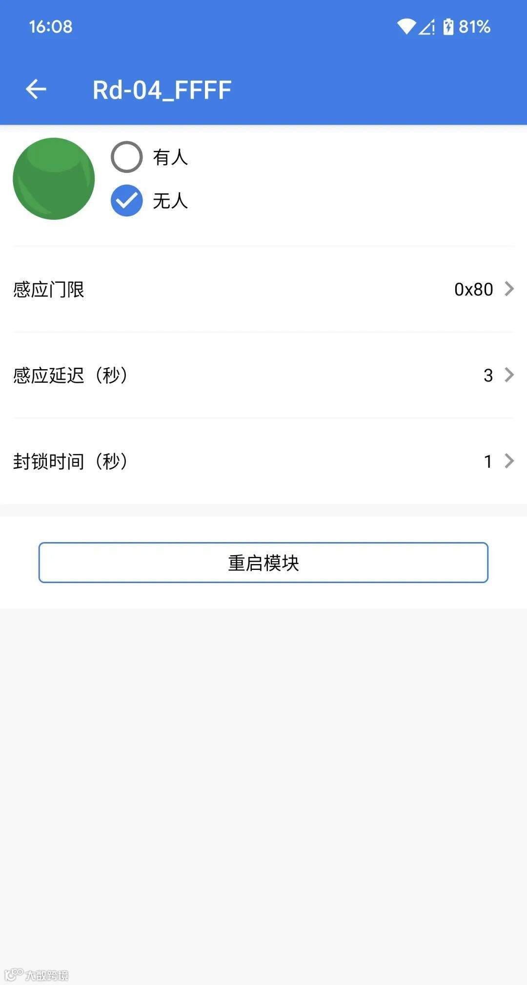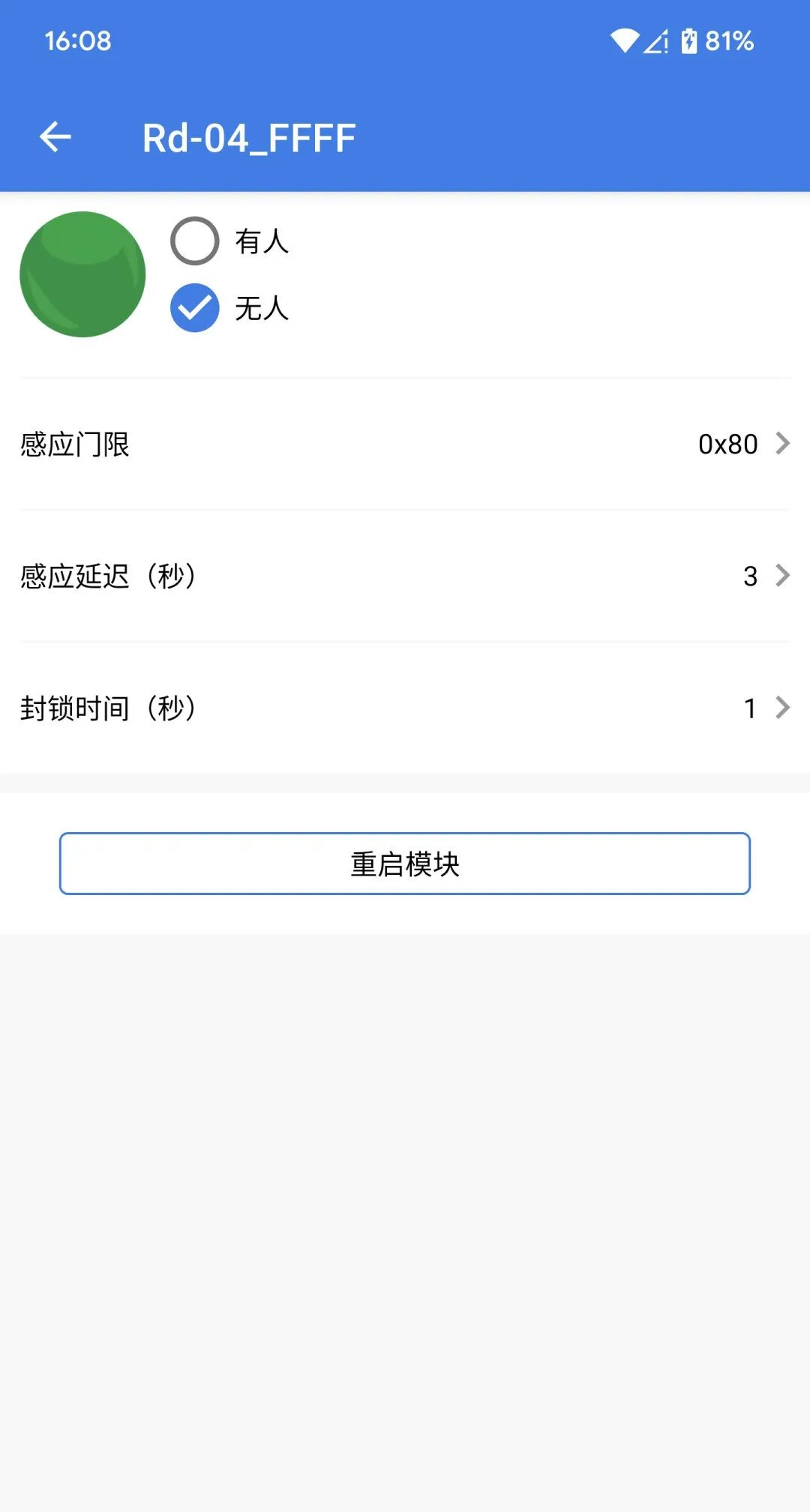 4.连接成功后进入如下界面,上半区显示目标的状态,可修改的配置有感应门限、感应延迟、封锁时间。