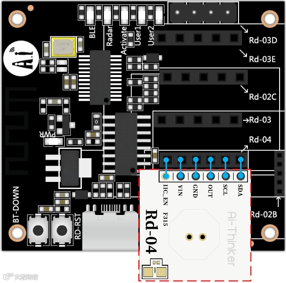 1.使用Rd-Kit配置Rd-04前,需要将Rd-04的板载MCU拆除,再手动添加I2C_EN的排针。