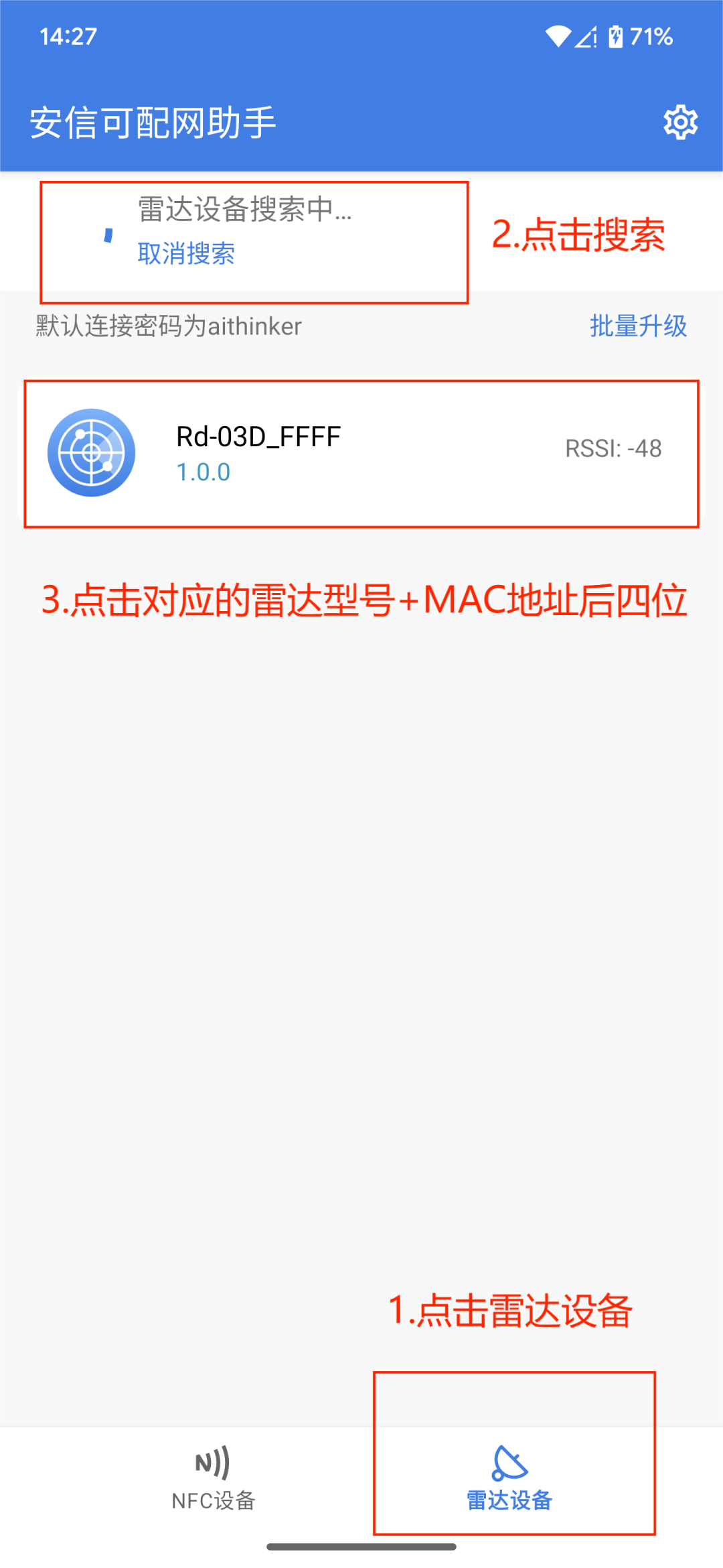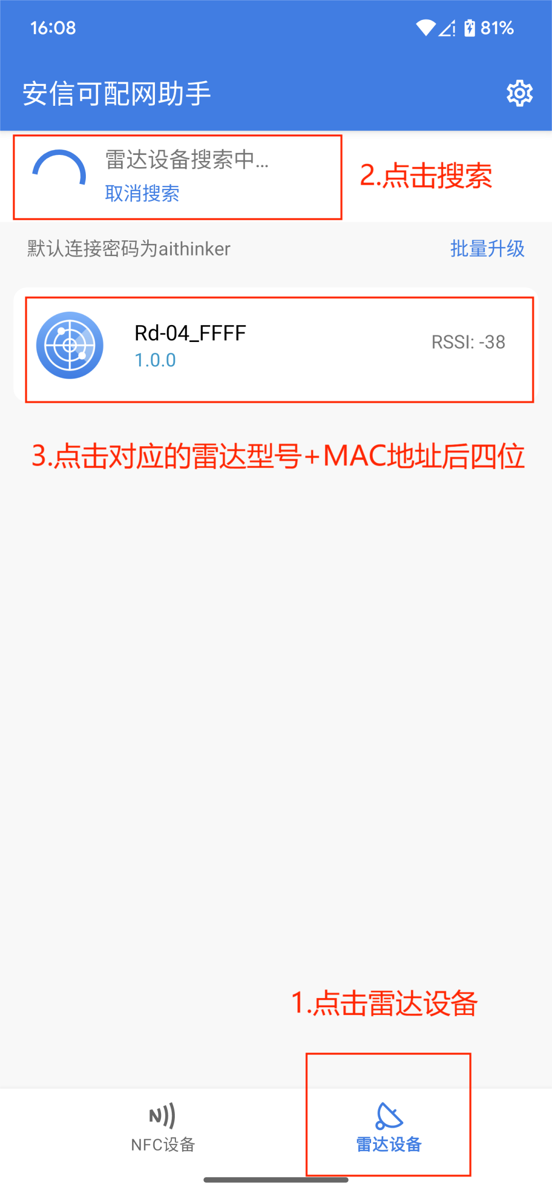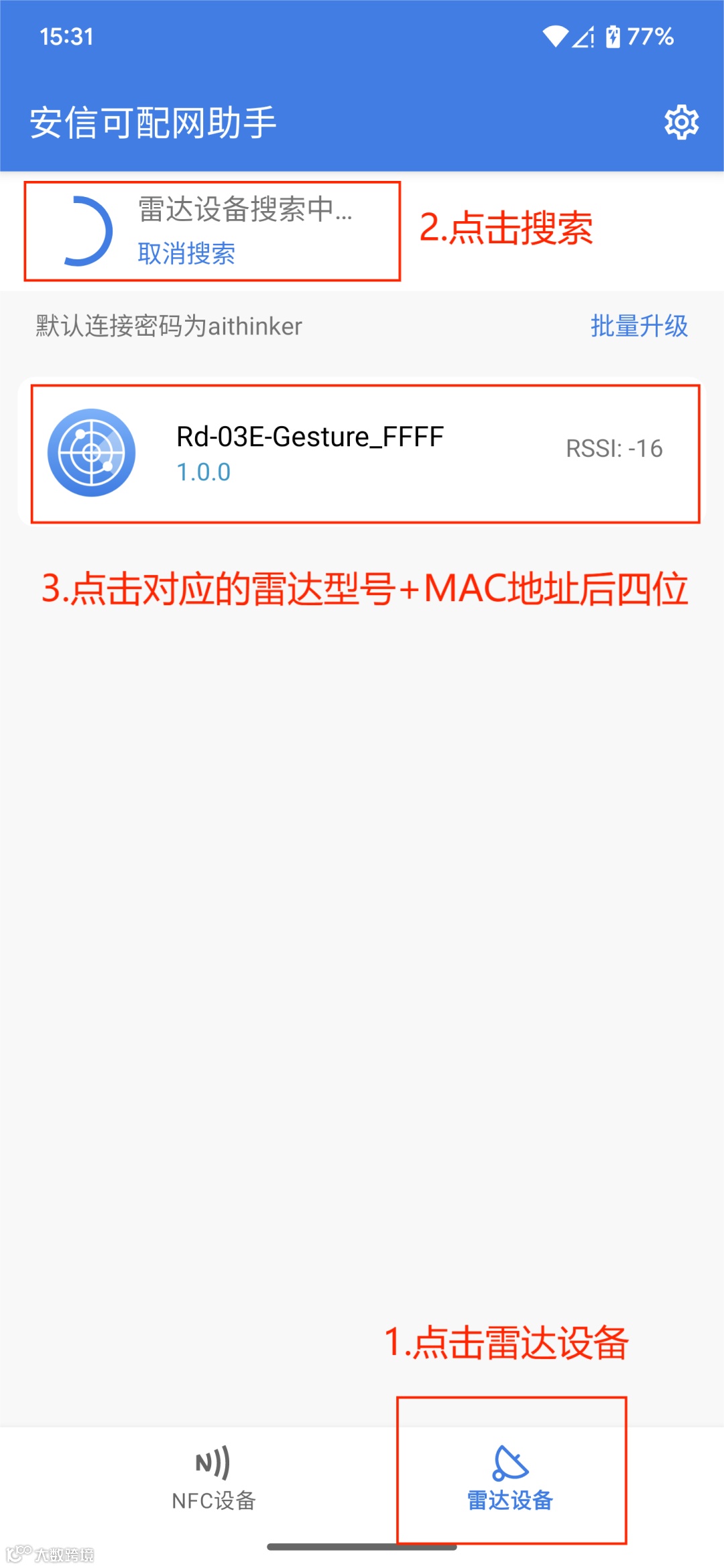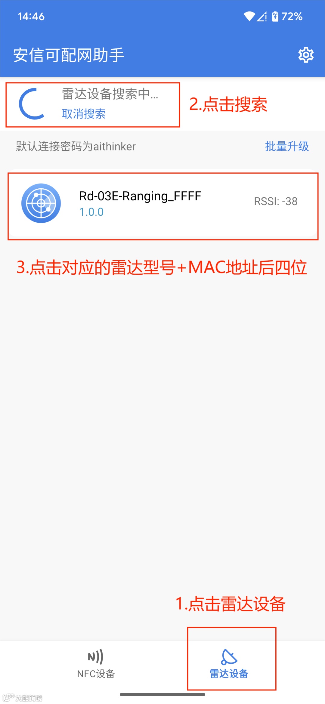 2.打开安信可配网助手,点击雷达设备,未弹出相应设备的情况下点击刷新,出现雷达型号+MAC地址后四位后,可点击接入相应的配置页面。连接成功后BLE LED熄灭。