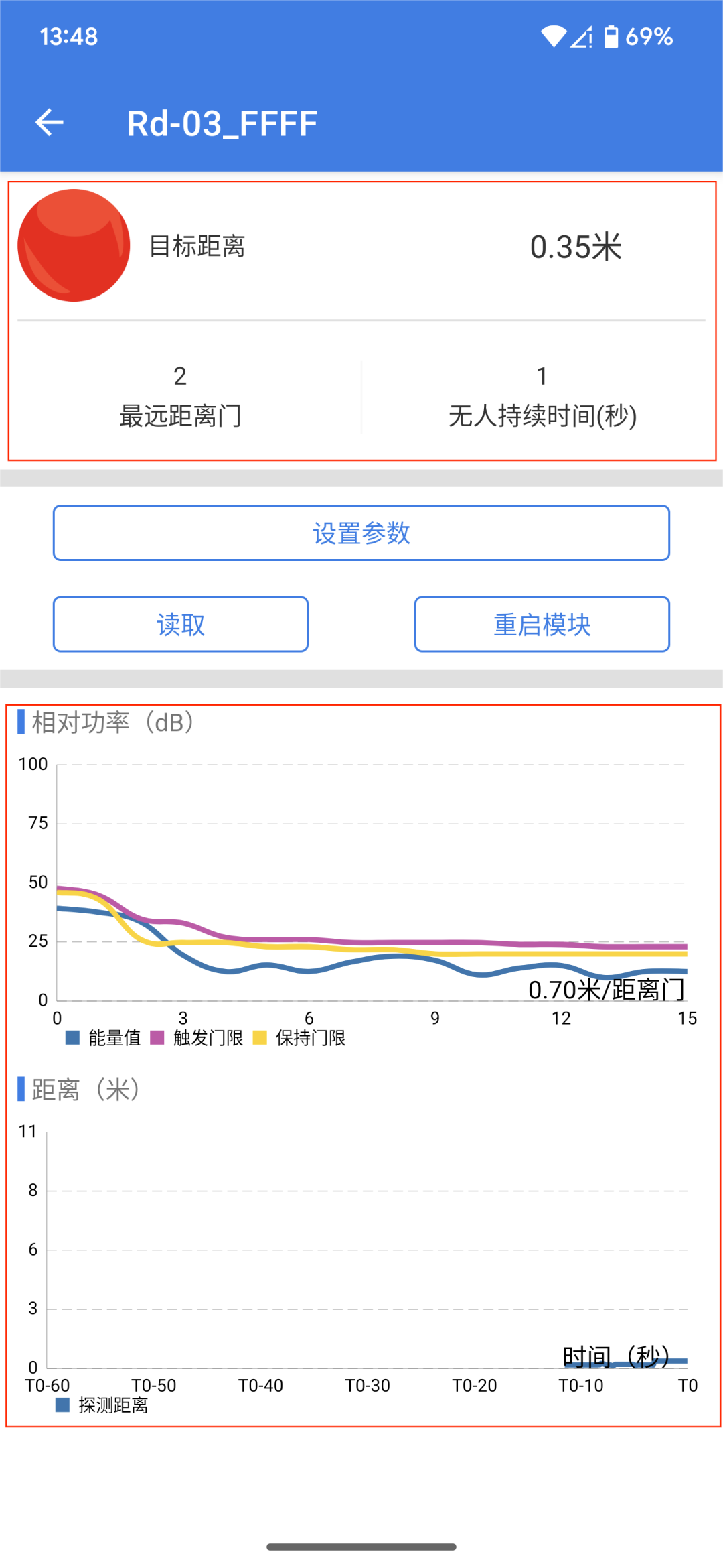 3.连接成功后进入如下界面,上半区显示当前雷达的数据,如触发状态,目标距离,最远距离门和无人持续时间,中间为设置的按钮,点击读取可刷新上半区的雷达配置参数,点击重启模块则为重启雷达模块。