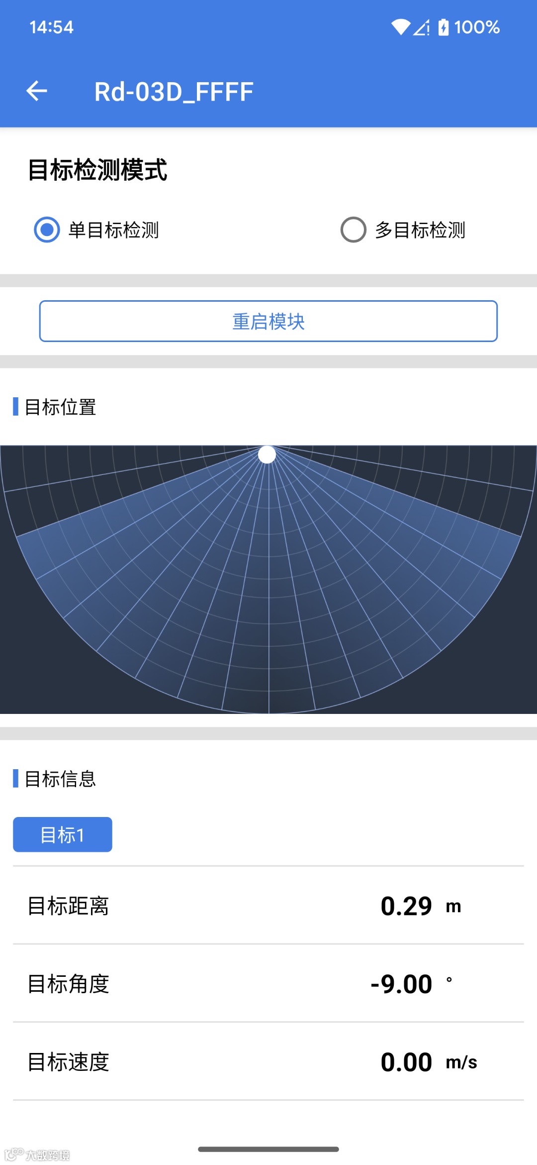 3.连接成功后进入如下界面,可切换雷达的目标检测模式,分为单目标检测和多目标检测,点击重启模块则为重启雷达模块。下半区则是目标位置和目标信息。