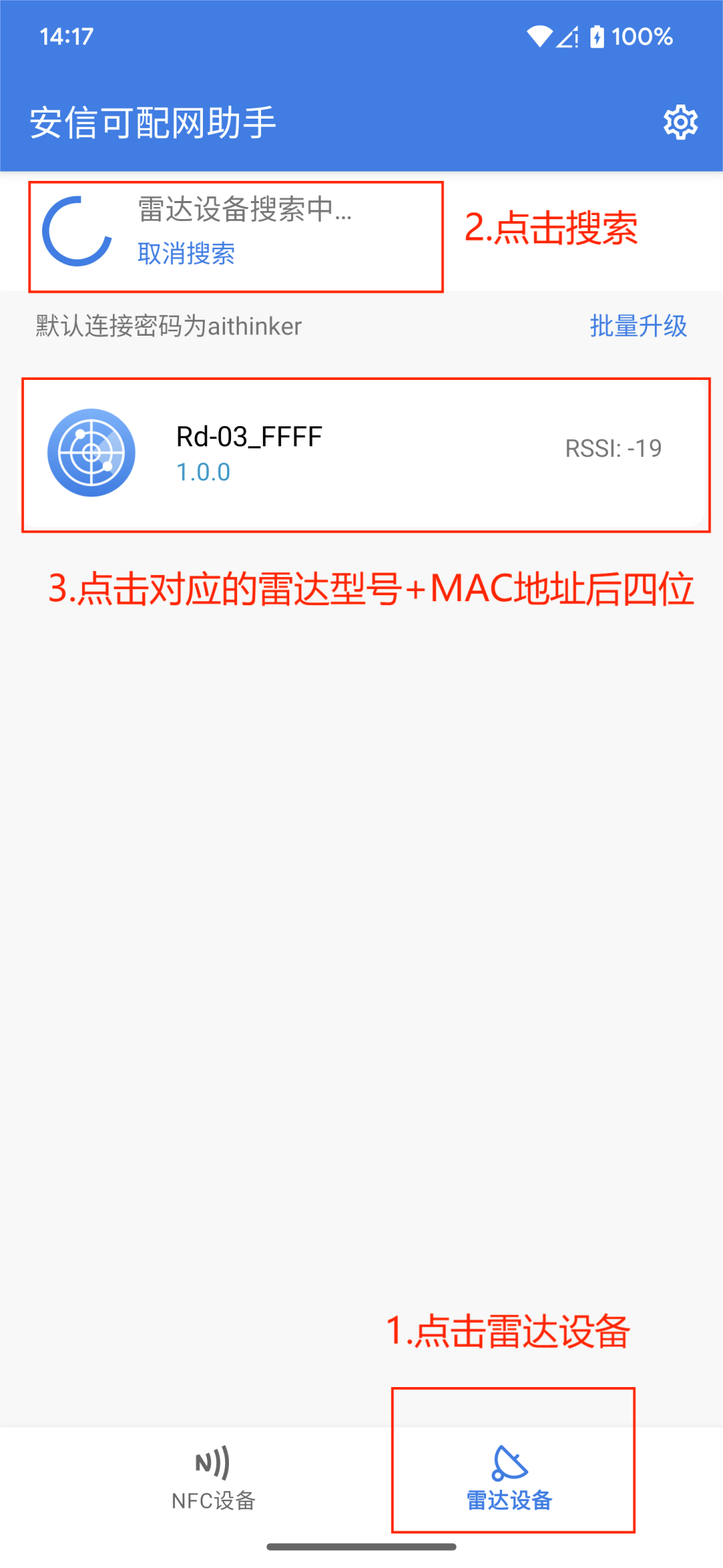 3.打开安信可配网助手,点击雷达设备,未弹出相应设备的情况下点击刷新,出现雷达型号+MAC地址后四位后,可点击接入相应的配置页面。连接成功后BLE LED熄灭。