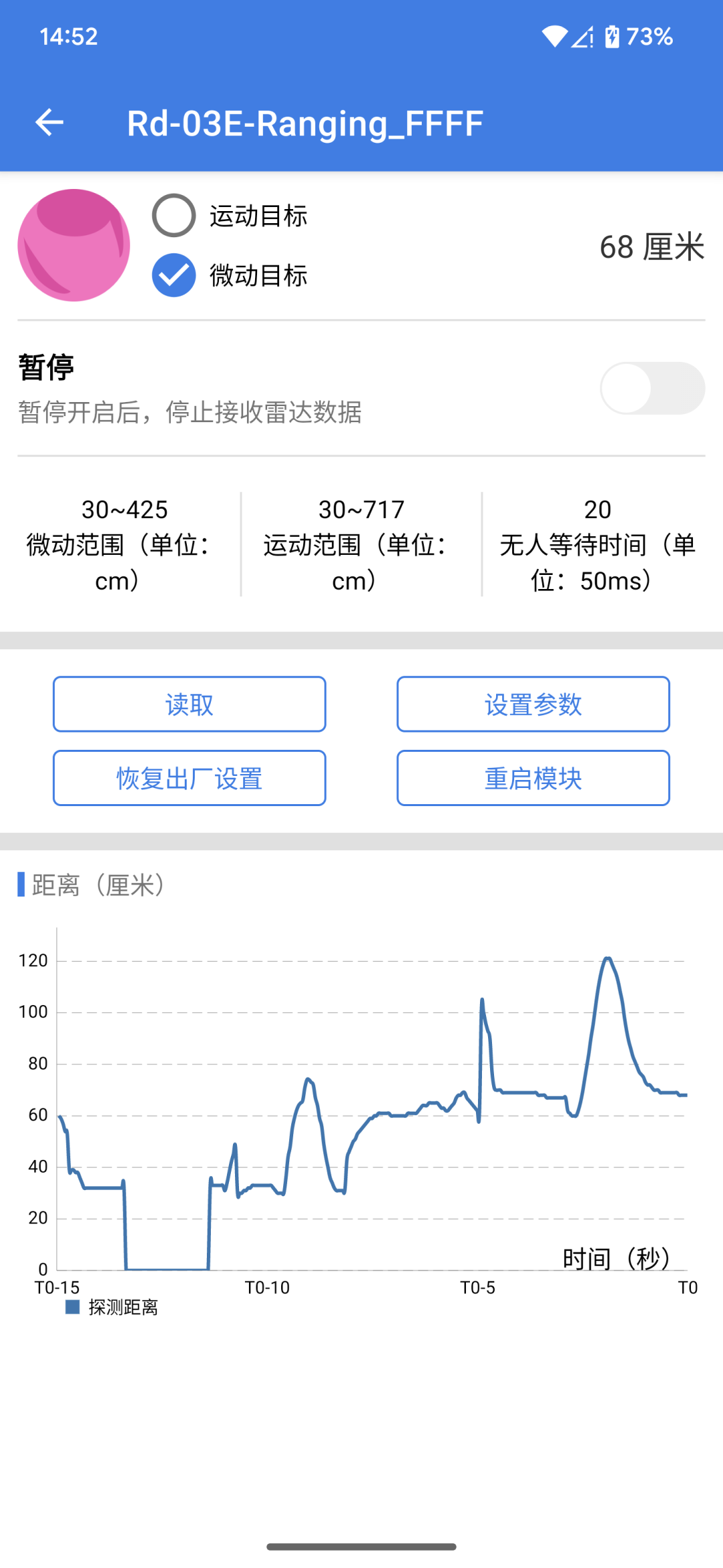 3.连接成功后进入如下界面,上半区显示当前雷达的数据,如目标触发状态,目标距离,微动检测范围、运动检测范围和无人持续时间,暂停按钮开启后则会停止接收雷达数据,中间为设置的按钮,点击读取可刷新上半区的雷达配置参数,点击重启模块则为重启雷达模块。