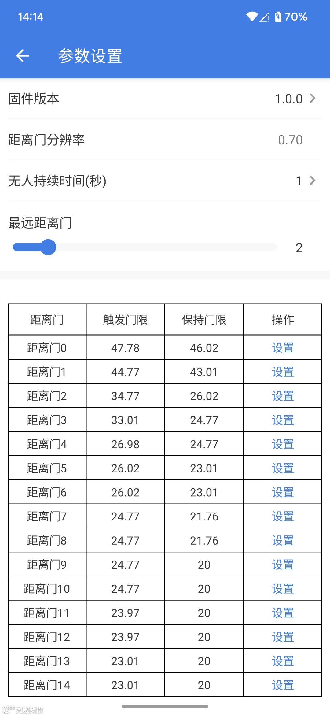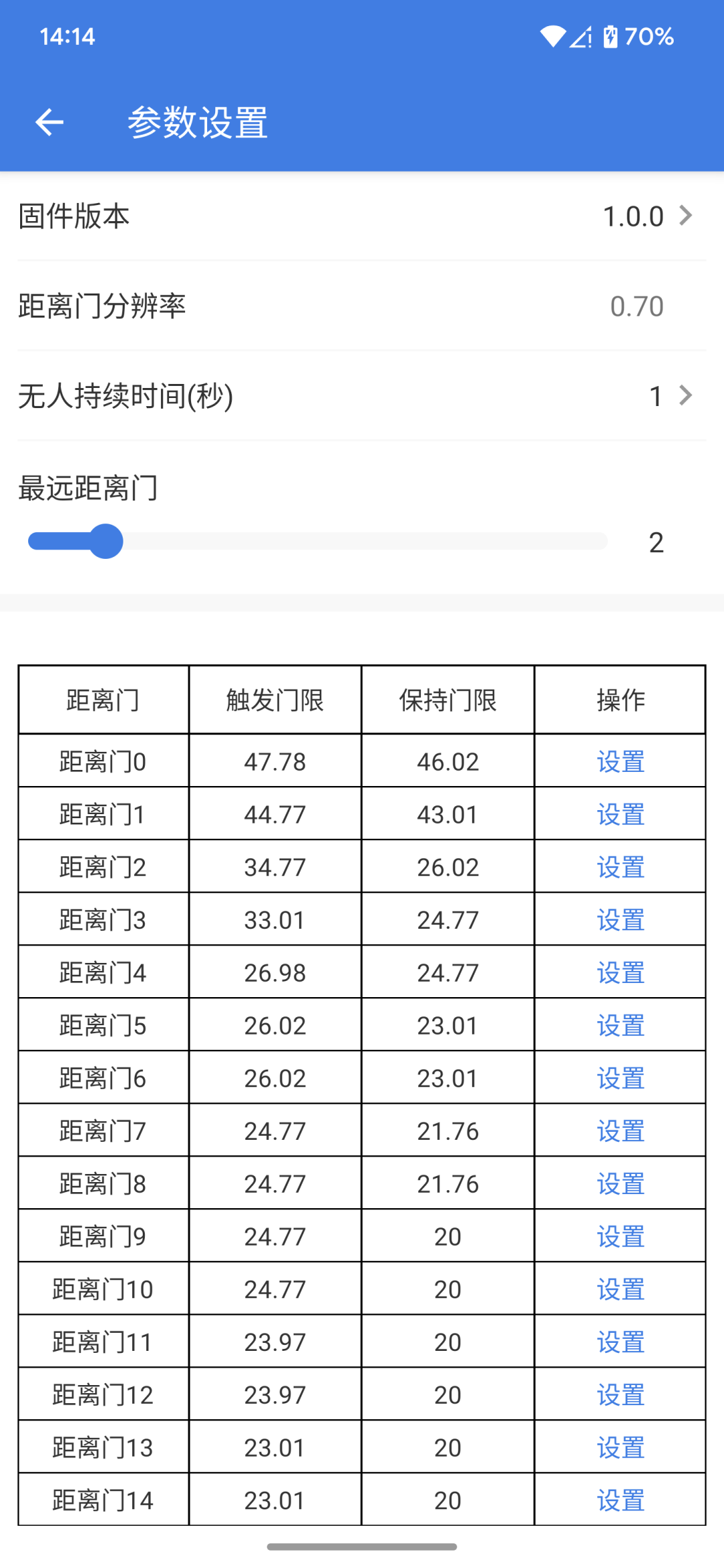 4.点击设置参数,可进入雷达的配置参数界面,可设置的数据有无人持续时间,以及各个距离门的触发门限和保持门限,通过滑动进度条的方式设置最远距离门。