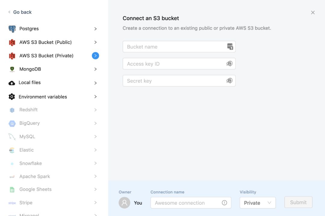 除了源码控制,DeepNote 笔记本还可以连接云计算数据存储,比如 S3、GCS 以及常用的数据库引擎。