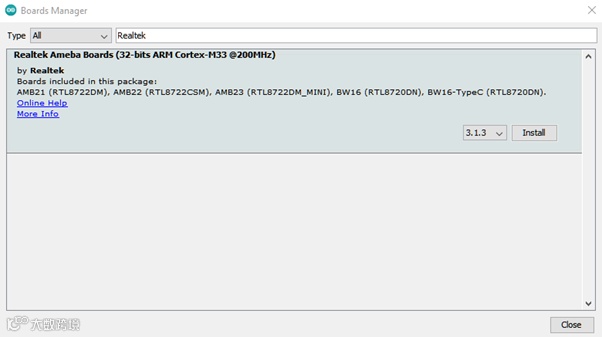 “Boards Manager”大约需要几秒钟来刷新所有硬件文件(如果网络状况不好,可能需要更长的时间)。在列表中找到“Realtek Ameba Boards (32-bits ARM Cortex-M33 @200MHz)”,点击“Install”,Arduino IDE会自动开始下载AmebaD包含BW16所需的文件。