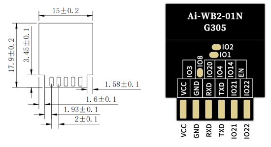 Ai-WB2-01N尺寸为17.9*15.0*3.1,属于小型DIP插针封装,集成Wi-Fi+BLE和低功耗的 32 位 RISC CPU的嵌入式双模模块。Ai-WB2-01N拥有276KB RAM, 2MBFlash,可支持扩展,以及SPI,UART,I2C,PWM,ADC,DAC 和 GPIO 等丰富的外围接口。
