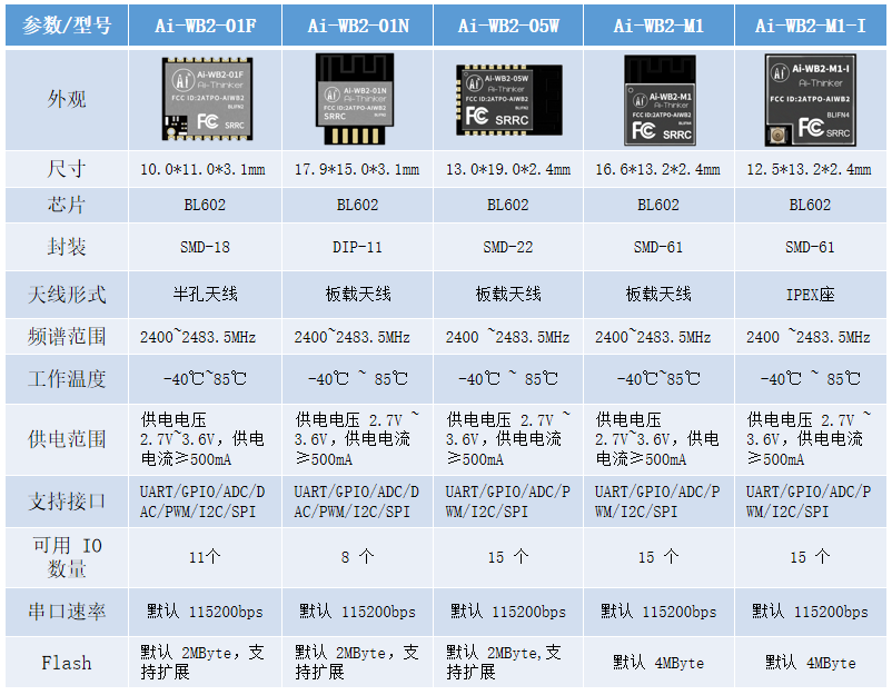 Ai-WB2-01N/01F/M1/M1-I/05W,这5款模组是安信可在去年推出的Ai-WB2系列中经典超小封装的WiFi+BLE模块,最小的Ai-WB2-01F尺寸仅为10.0*11.0*3.1mm,最大限度地满足终端产品对小尺寸模组产品需求,有效帮助客户减小产品尺寸并优化产品成本。