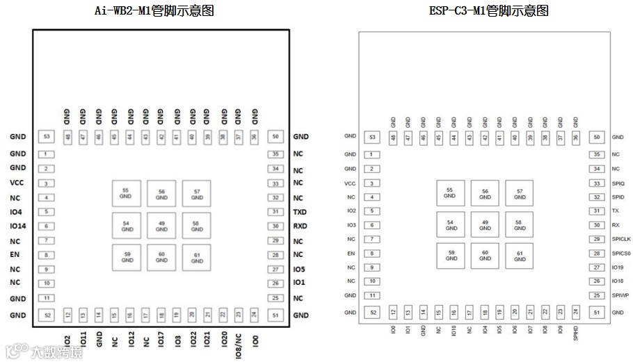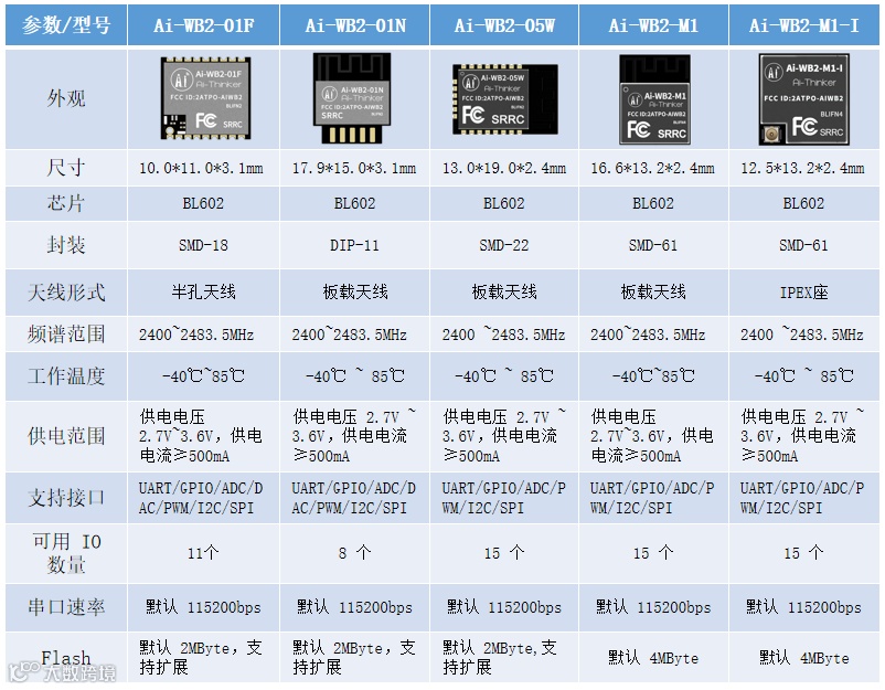 Ai-WB2-M1/M1-I/05W这三款超小SMD封装模组,也是集成Wi-Fi+BLE和低功耗的 32 位 RISC CPU的嵌入式双模模块。值得一提的是,Ai-WB2-M1/Ai-WB2-M1-I这两款模组是经典Mini封装系列(ESP-C3-M1/ESP-C3-M1-1)的高性能新产品,Ai-WB2-M1系列保留了经典的极小封装,做到了与Mini系列尺寸完全一致,硬件完全兼容,在功能上,也有所迭代。