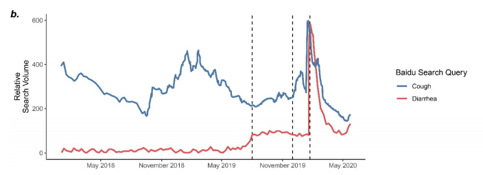 美国哈佛大学在学术平台“DASH”发布了一篇论文:《武汉在2017年秋天就可能有(新冠)病毒迹象》,其中使用百度指数搜索查询了2017年4月-2020年5月关于“咳嗽”、“腹泻”两个关键词的搜索数据量,得出了论文中的结论。[3]