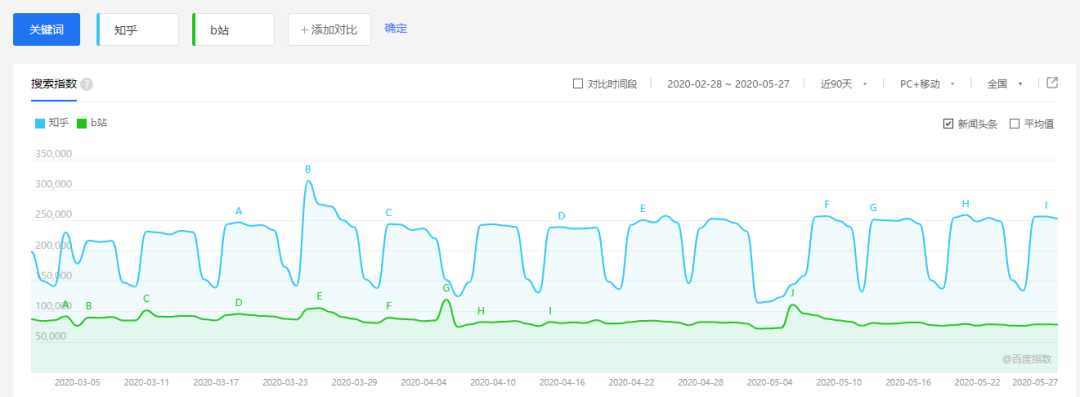是不是看出有一个规律:知乎每到周未百度指数下跌很厉害,而b站却没有像知乎下滑这么深谷