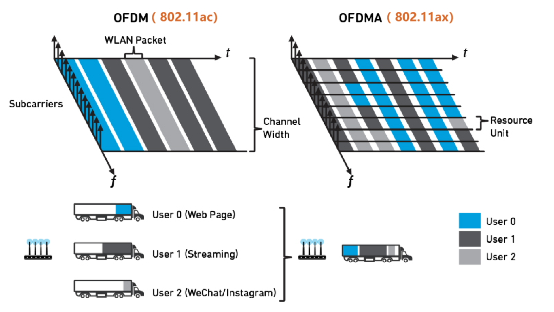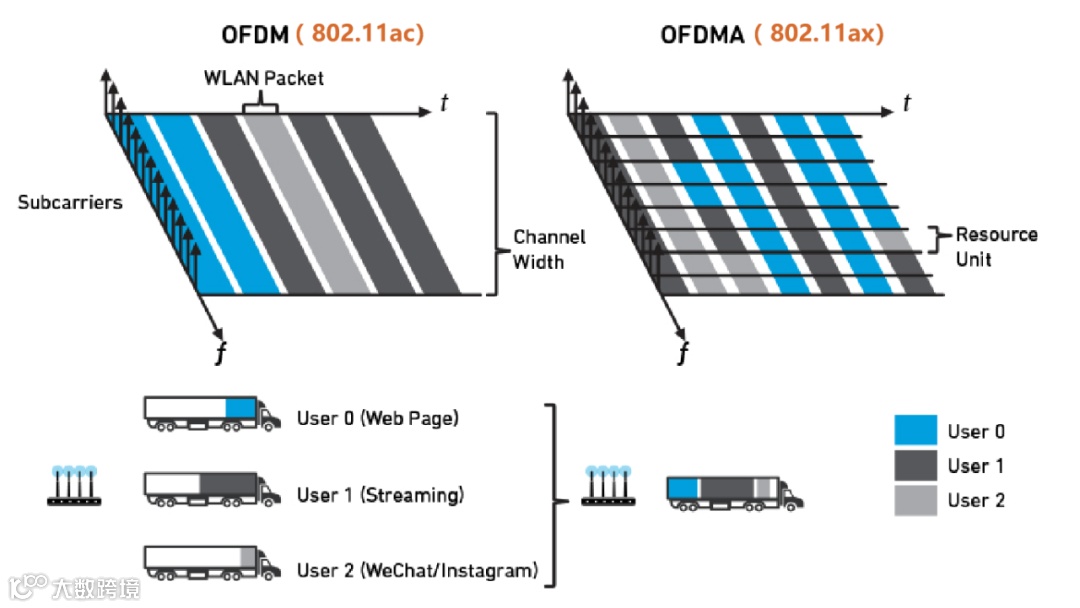 ● OFDMA的全称是正交频分复用多址。相当于把一条大路划分成了并行多个车道,通行效率自然就大幅提升了。支持多个用户在同一时刻共享所有子载波,数据被统一打包,共同装车,发货速度大大提升。